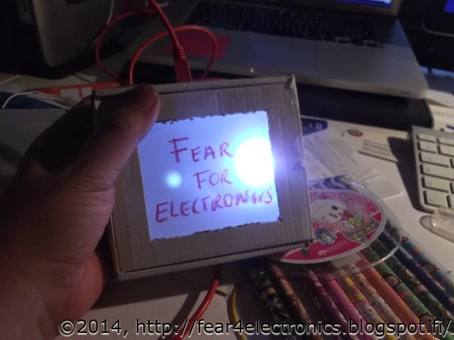 So from that box, I cut a rectangle from the cover (see next photo). In this hole I will put the paper with the word I want to light.